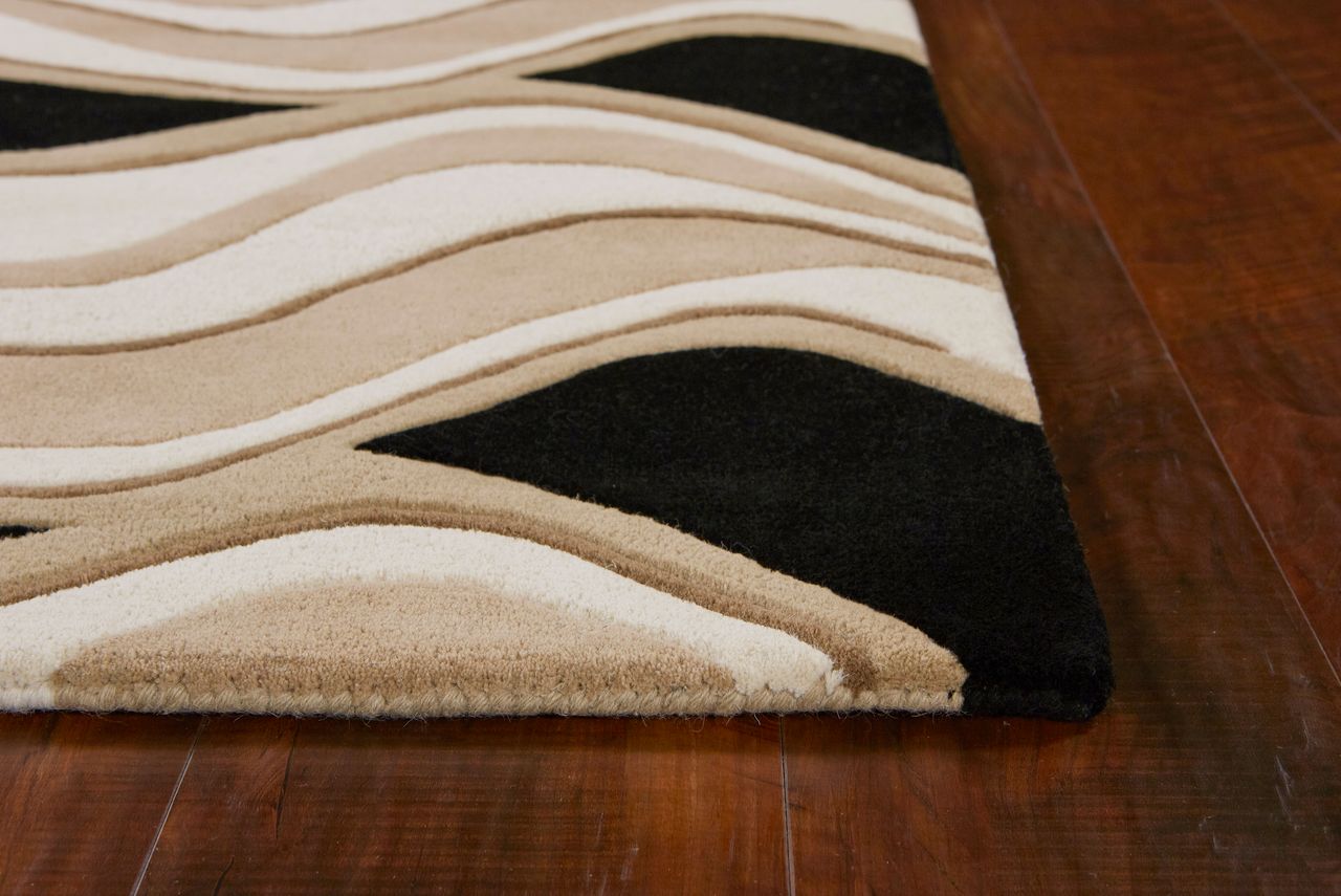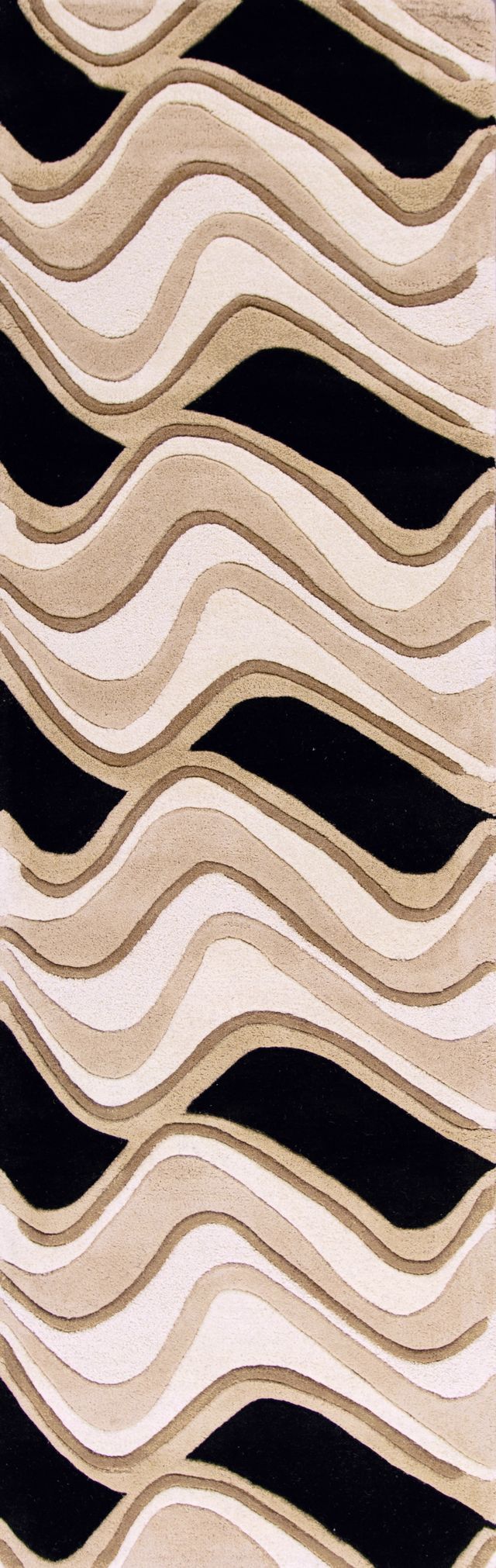 Step into our world and experience a multi-textured masterpiece from our Eternity Collection. Hand- tufted in India of 100% quality wool, these rugs are woven using multi-textured wool, a versatile color palette and a Hi/Lo effect, bringing modern simplicity into our lives. The combination of timeless colors and a variety of textures will create an everlasting presence in any room while setting the foundation for any decorating style. Eternity 1071 Black/Beige Waves 2'3" x 7'6" Runner. Hand Tufted of Multi-Textured Wool with Cotton Backing. Made in India. Vacuum regularly & spot clean stains. Professional cleaning recommended periodically.