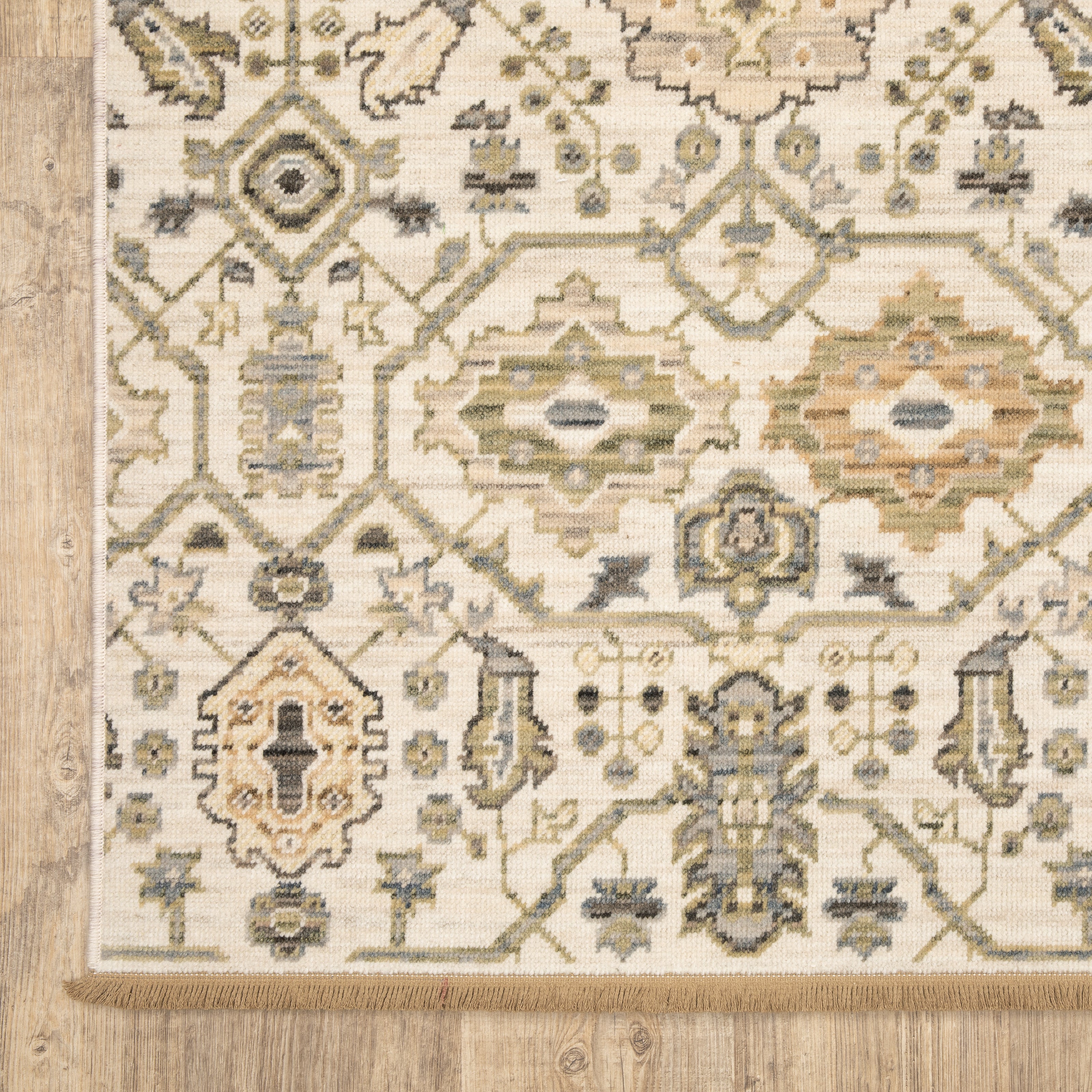 The classically styled Acacia collection features earthy, neutral tones of saturated brown, warm birch and muted gold which are subtly accented with touches of slate blue, soft clay, and moss green. The space-dyed wool and nylon blend is woven in Egypt on an Axminster loom and features incorporated cotton fringe.