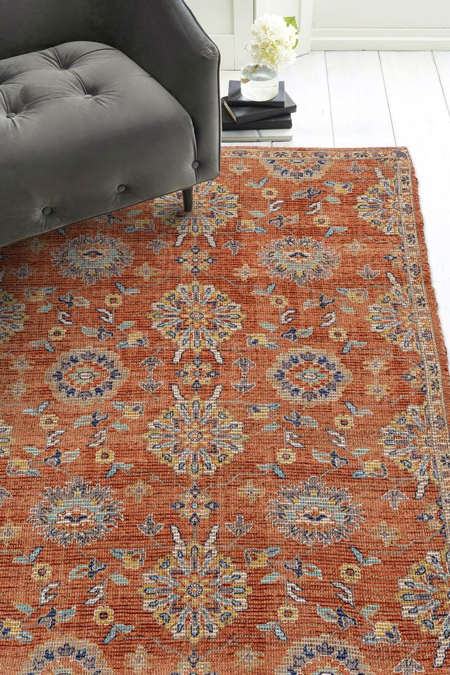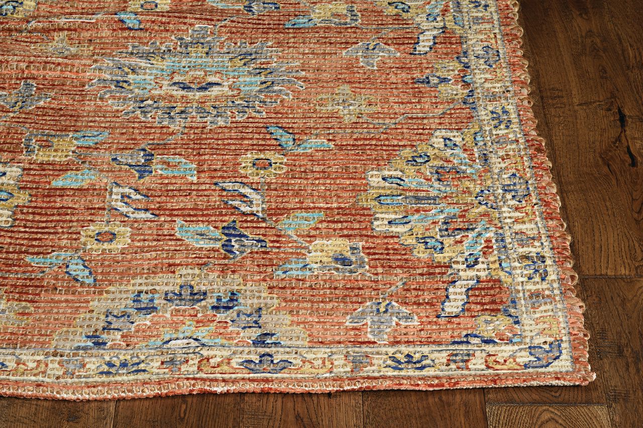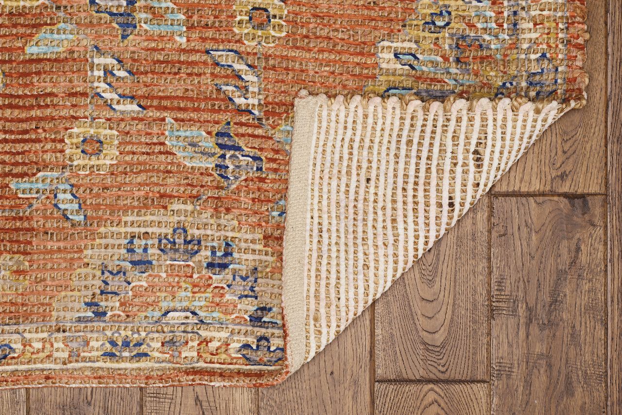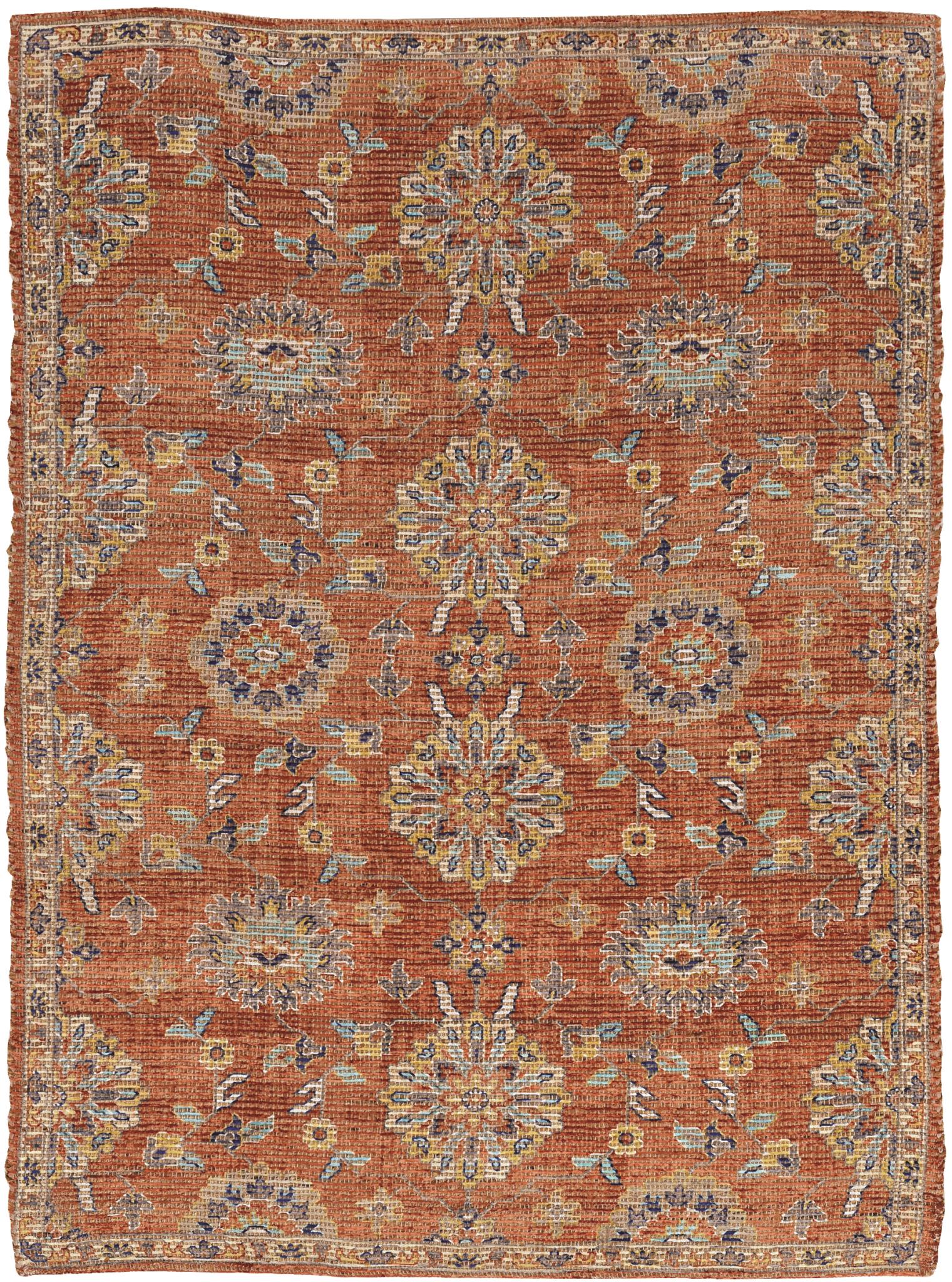 Our Morris rugs portray the beauty of old world tradition with a modern twist. Hand-woven jute and polyester chenille chindis designed with vibrant and trendy colors in distressed traditional prints. Keeping the tradition authentic, these rugs are made in India and have a low ?ªŸ? pile height. These rugs are a beautiful accent piece whether your style is classic and traditional or unique and trendy. Morris 2230 Spice Chloe 27" x 45". Handwoven of Jute & Polyester with No Backing. Made in India. Vacuum regularly & spot clean stains. Professional cleaning recommended periodically.