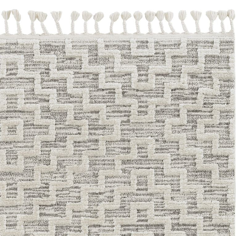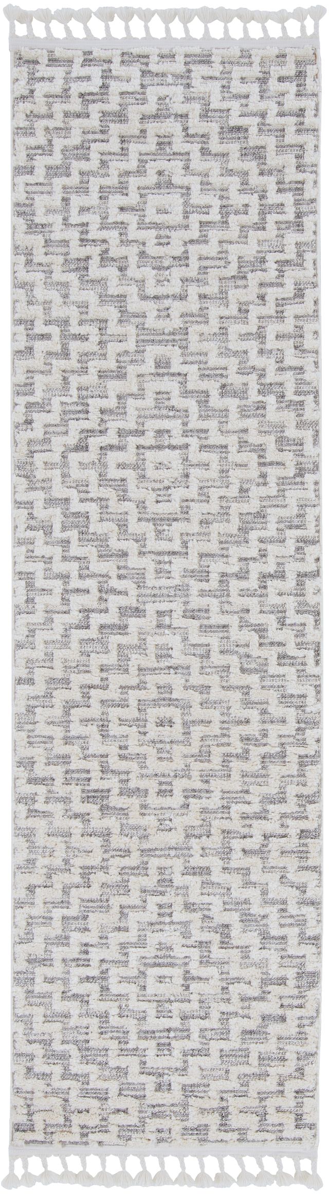 Combined with comfort, style, and design these rugs are out of this world trendy! Willow is 100% polyester machine woven with a decorative cut loop pile and of course, fringe! These rugs will be a statement piece in your home for years. Exclusively made in Turkey. Willow 1104 Ivory Grey Geo 2'2" x 7'6" Runner. Machine Woven of Polyester with No Backing. Made in Turkey. Vacuum regularly & spot clean stains. Professional cleaning recommended periodically.